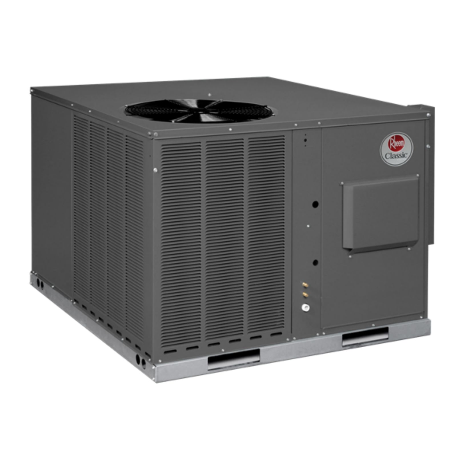 Rheem Classic® Series feature Scroll compressors for maximum efficiency and quiet operation.FeaturesLouvered condenser compartment for protecting the coil against yard hazards and/or weather extremes.One-piece top with a deep flange to help keep water out of the unit.Supply and return air openings feature a one-inch tall flange to prevent water migration into the ductwork.Access panels have "weep holes" and channels to further help manage water run-off.Side and down discharge options available on all models. All models are shipped ready for horizontal application.Easily accessible blower section complete with slide-out blower.Refrigerant connections are conveniently located for easy service diagnostics.Micro Channel evaporator and condenser delivers superior performance with less refrigerant charge and less weight than conventional copper tube/aluminum fin coils. In addition the all aluminum construction has superior protection against formicary corrosion and aluminum tube rubbing potential. Its easier to clean and has a more robust surface.Inside the easily accessible furnace compartment is the draft inducer motor. This motor is specially designed for quiet reliable operation. In addition to the draft inducer motor, the in-shot gas burners and manifold efficiently regulate the flow of gas for combustion. These new gas/electric units also feature direct-spark ignition and remote flame sensors for added reliability and efficiency.All units feature an internal trap on the condensate line eliminating the need for installing an on-site external trap.Easily accessible control box.Single point wiring simplifies installation.Our gas/electric package units feature a tubular heat exchanger design. Tubular heat exchangers are more efficient and durable than older-style clamshell heat exchangers. The heat exchanger is backed by a 10 year limited warranty. Models with a stainless steel heat exchanger installed in a residential application are backed by a limited lifetime warranty.Thermal expansion valve standard on all models for superior superheat control, reliability, and energy efficiency at all operating conditions.Filter drier standard on all models (not shown).Rugged base rail included for improved installation and handlingComplete factory charged, wired and run tested.Molded compressor plugs.A double sloped evaporator coil drain pan assures all water is removed from the unit to improve indoor air quality.General Terms Of Limited Warranty*Rheem will furnish a replacement for any part of this product which fails in normal use and service within the applicable periods stated, in accordance with the terms of the limited warranty.Heat Exchanger -Factory Standard: Ten (10) Years, Stainless Steel/1-Phase & 3-Phase Models Commercial Application: Twenty (20) Years, Stainless Steel/1-Phase Models Residential Application: Limited LifetimeConditional Parts (Registration Required) - 1 Phase, Residential Applications: Ten (10) YearsCompressor - 1 Phase, Residential applications: Ten (10) Years, 1 & 3 Phase, Commercial Applications: Five (5) YearsParts - Commercial Applications: One (1) Year*For complete details of the Limited and Conditional Warranties, including applicable terms and conditions, contact your local contractor or the Manufacturer for a copy of the product warranty certificate.